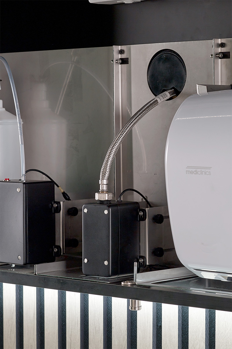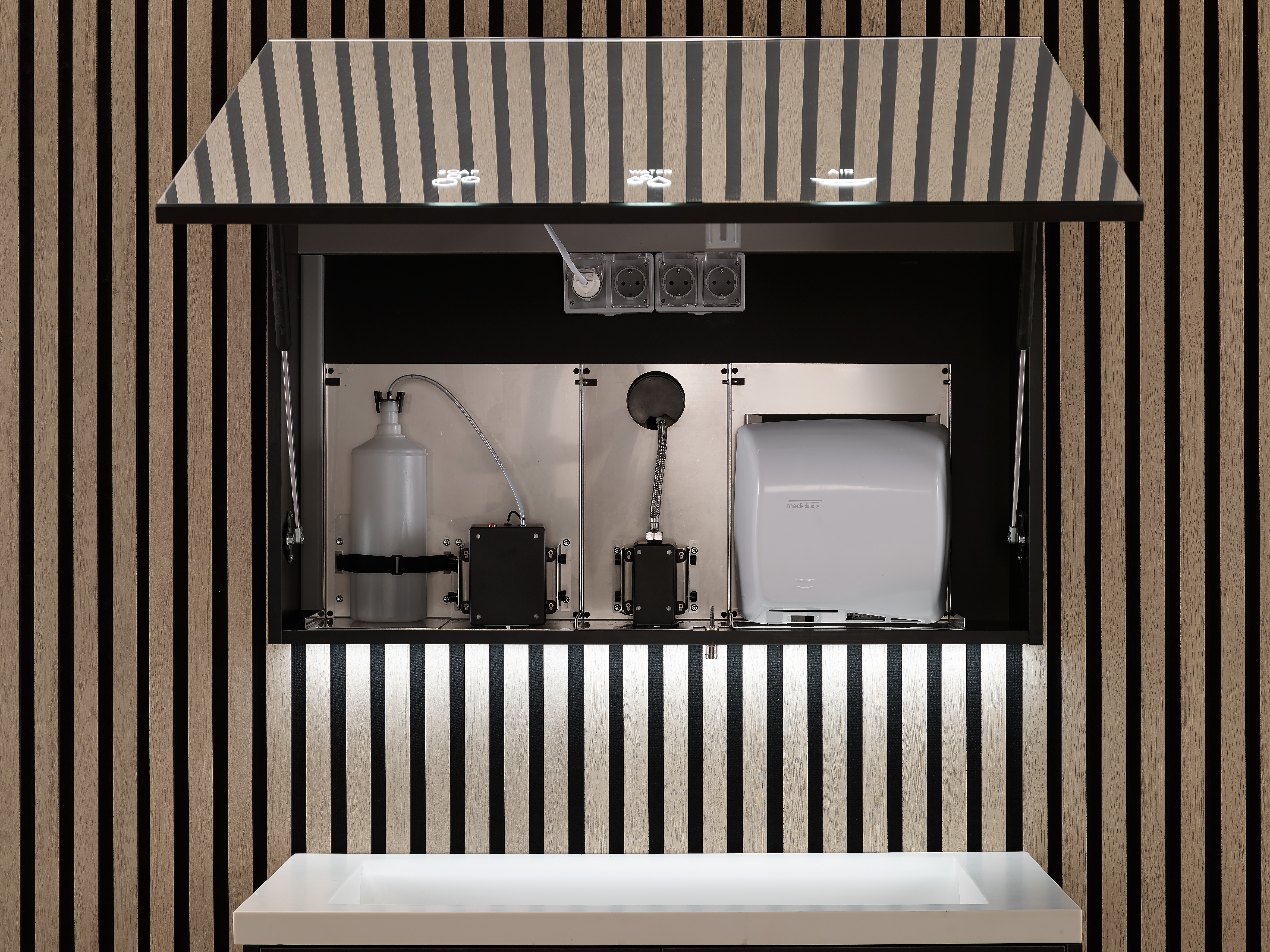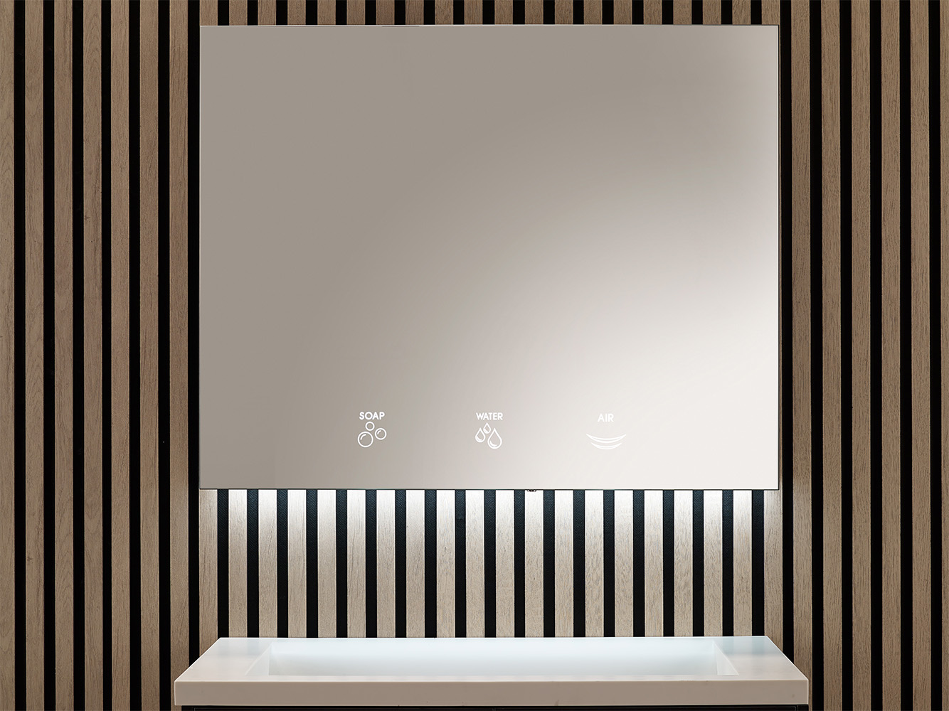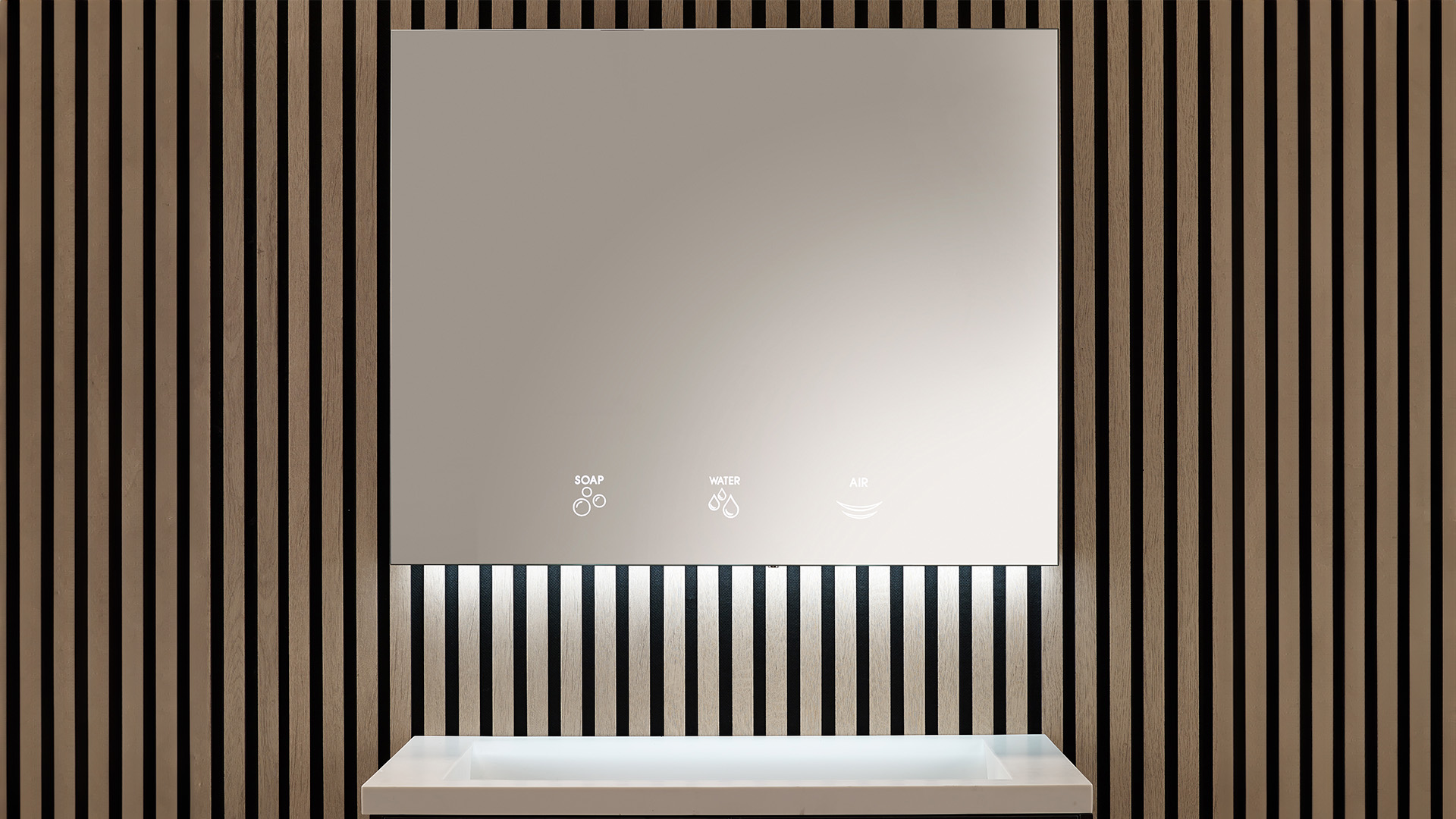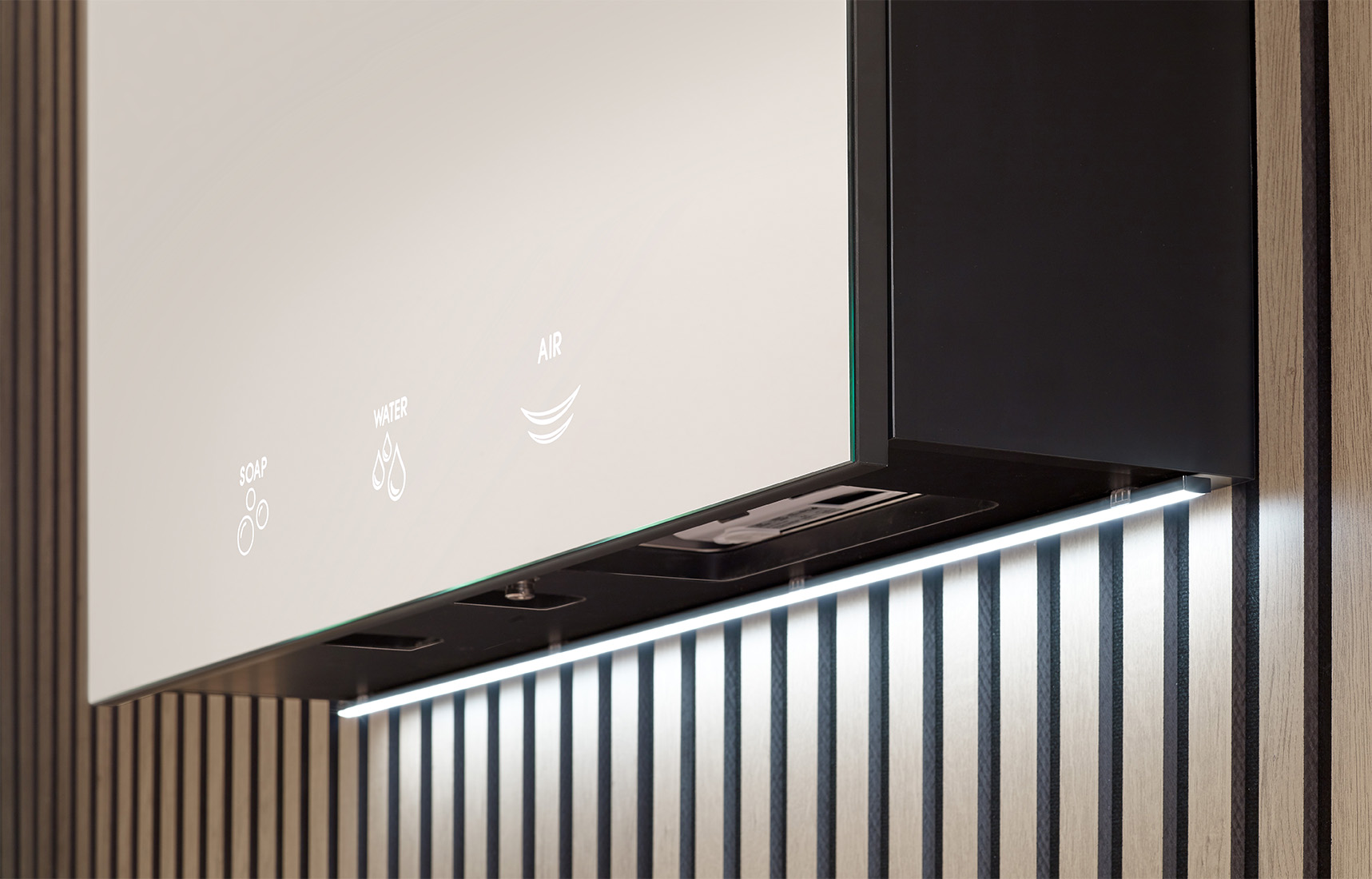 Sistema de lavado y secado de manos integrado detrás del espejo.