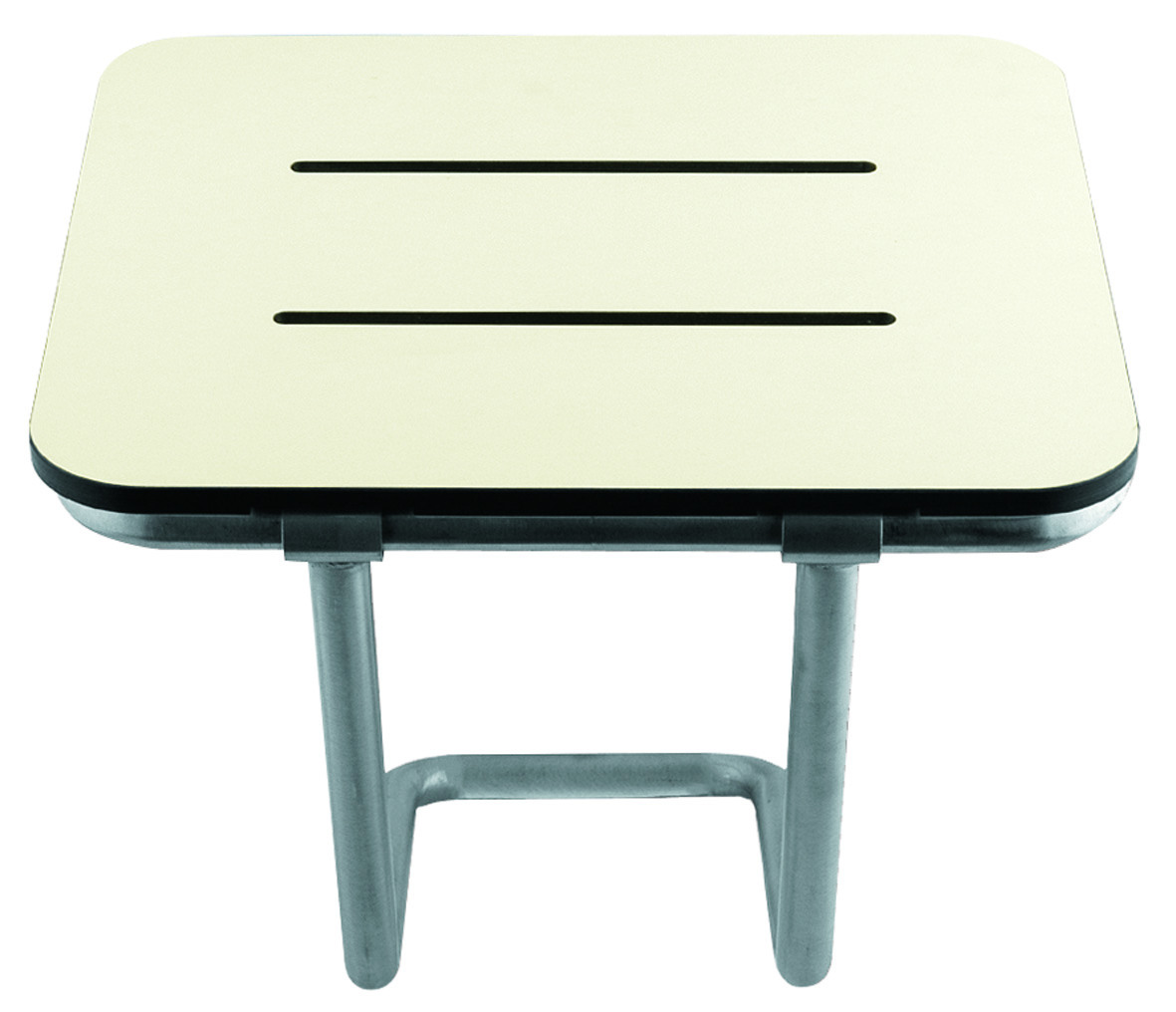Asiento abatible con pata a pared, fabricado en resina fenólica color marfil y estructura de acero inoxidable AISI 304 con acabado satinado.