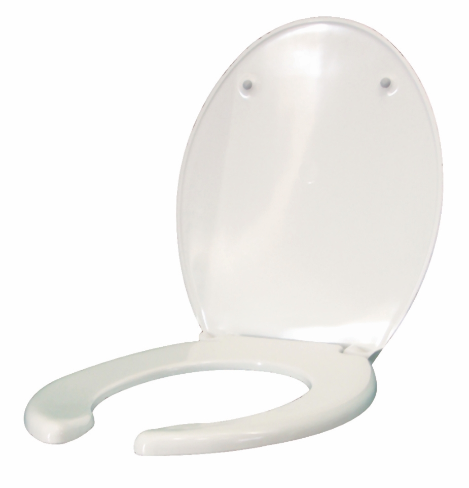Asiento de inodoro blanco con apertura frontal y tapa en resina termoendurecible Duroplast.