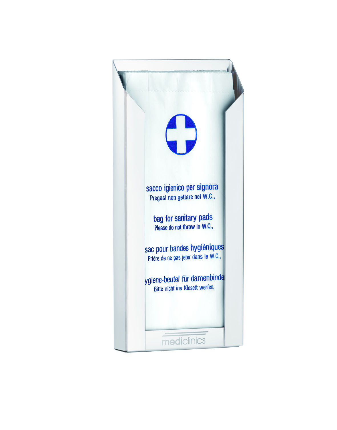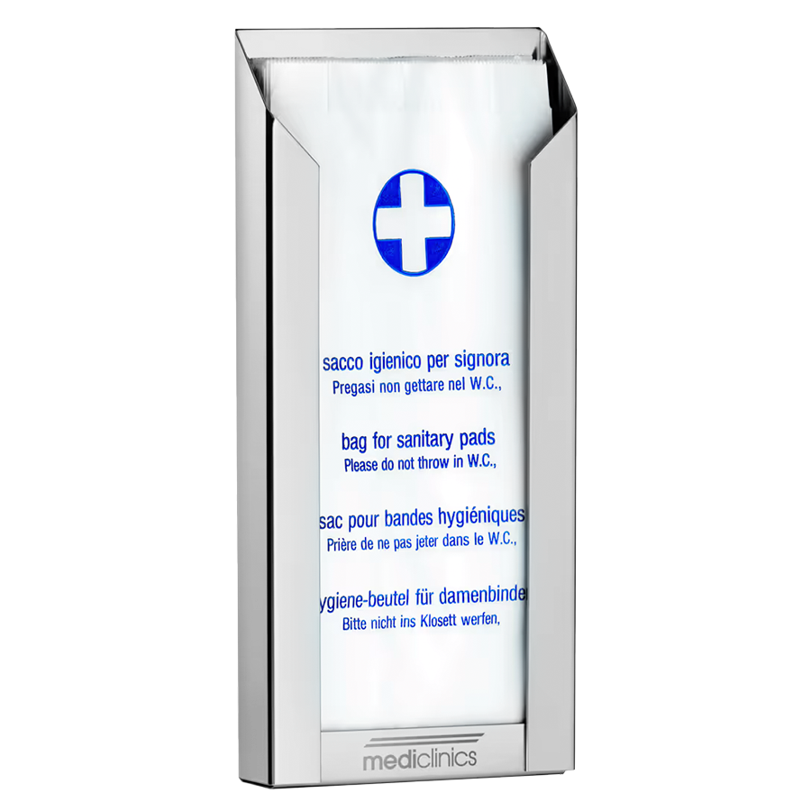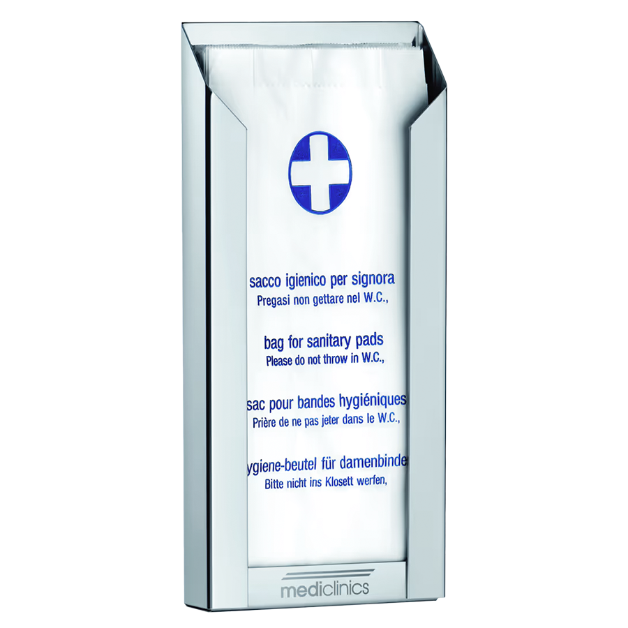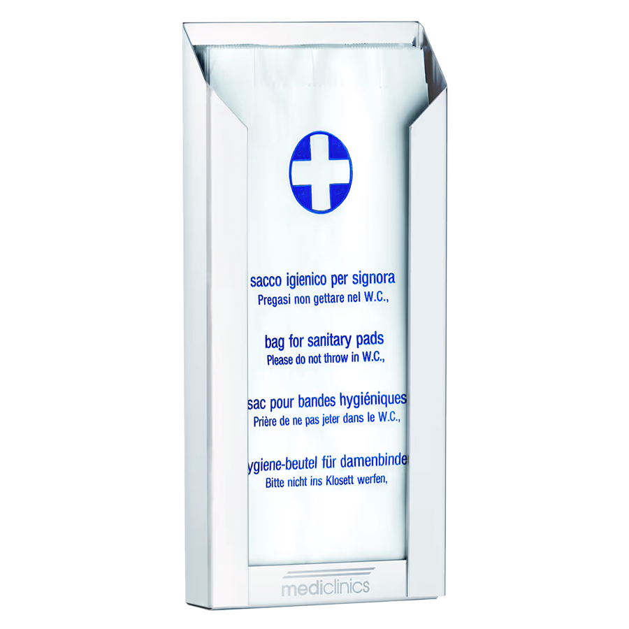 Dispensador de bolsas higiénicas para adosar en pared, diseñado y fabricado por Mediclinics.