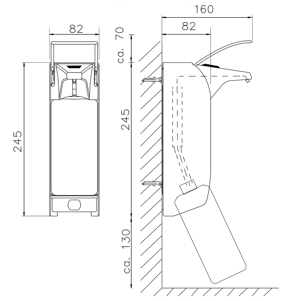 Dispensador de jabón líquido para adosar en la pared fabricado en aluminio.