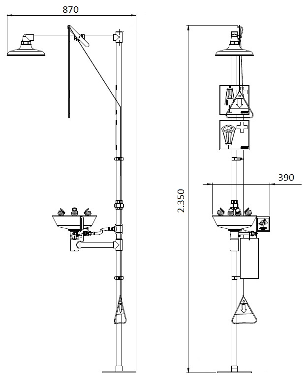 • Ducha con tirador triangular y lavaojos de apertura lateral manual; incluye tirador adicional accesible para usuarios en silla de ruedas.