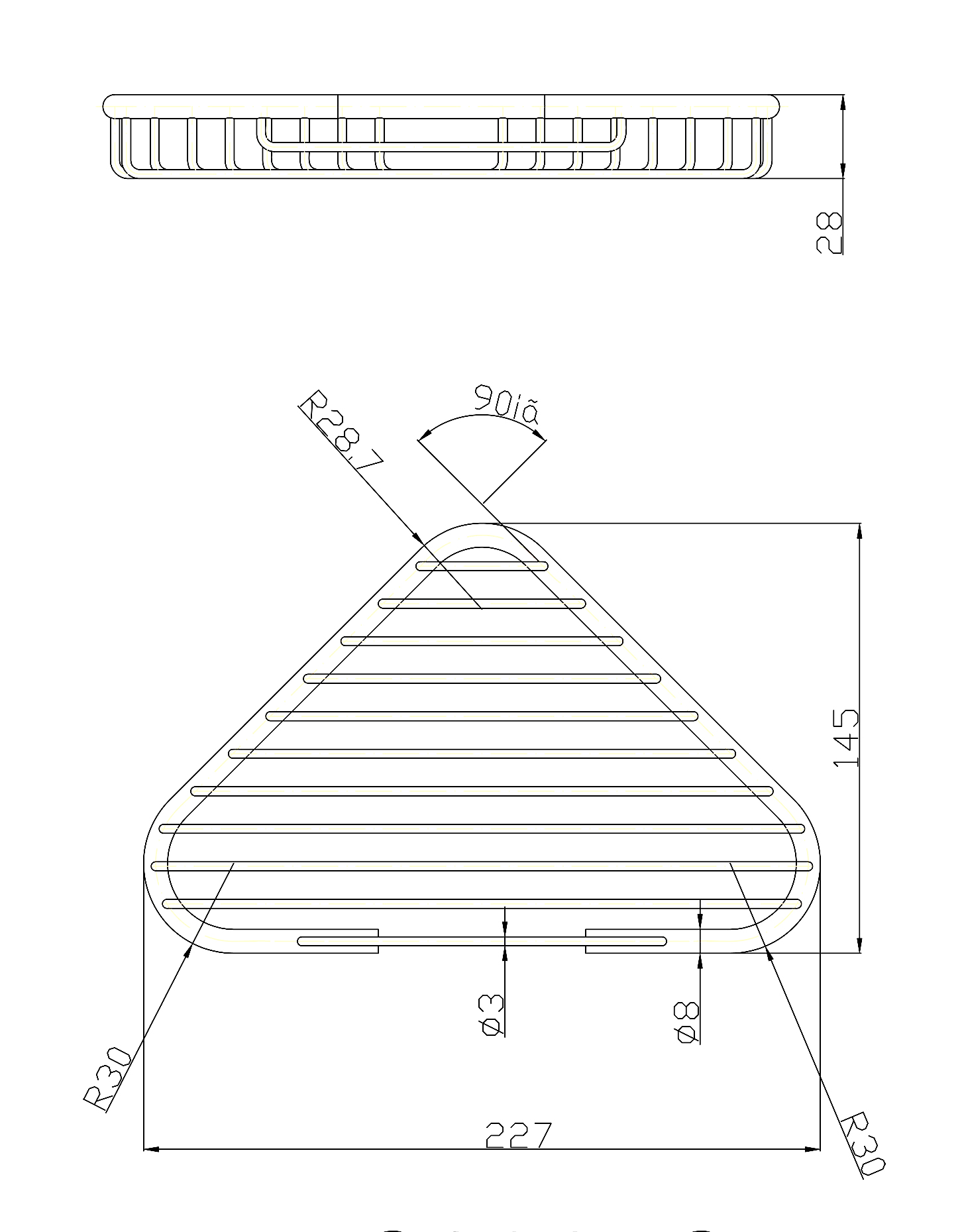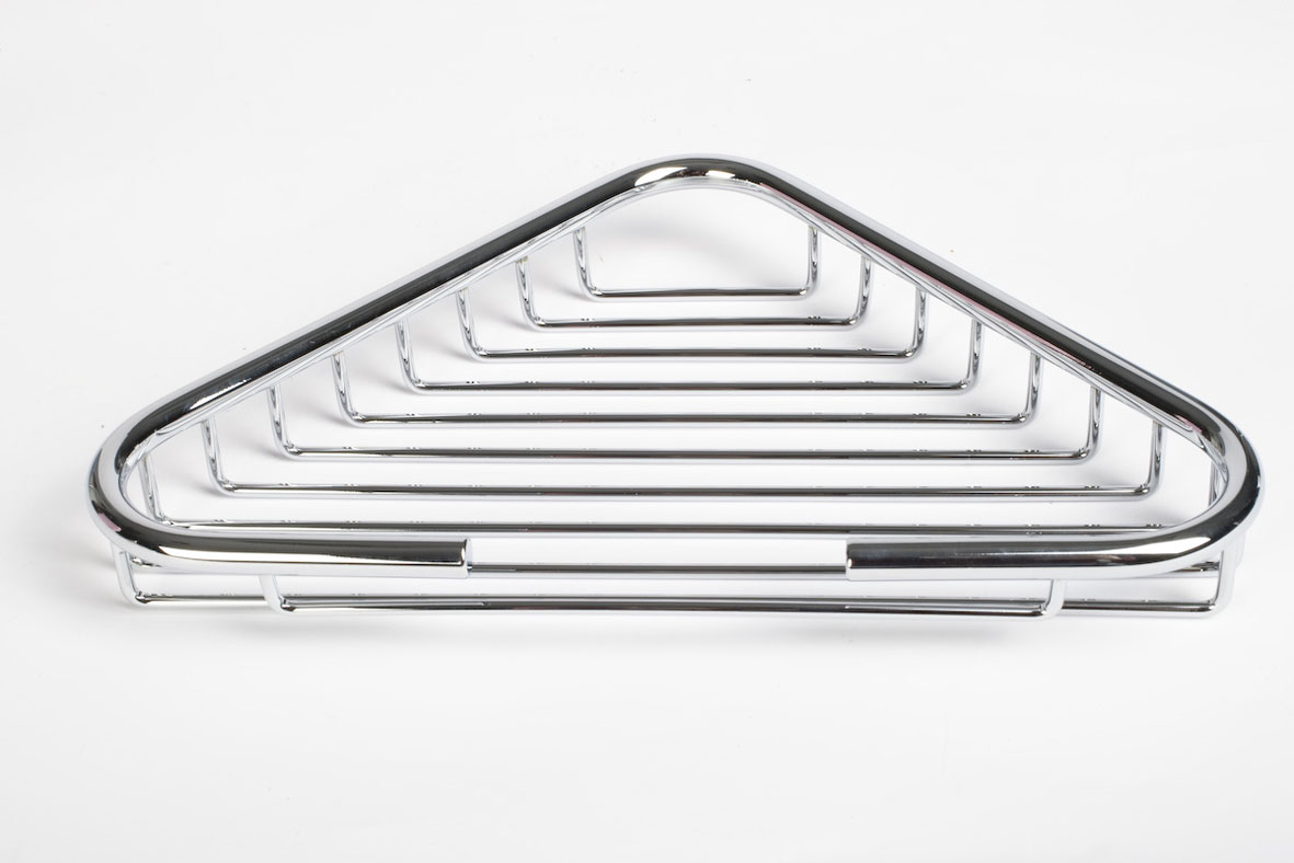 Jabonera triangular de rejilla para instalar en un rincón de la pared, formada por un bastidor perimetral superior y una cesta de contenido.
