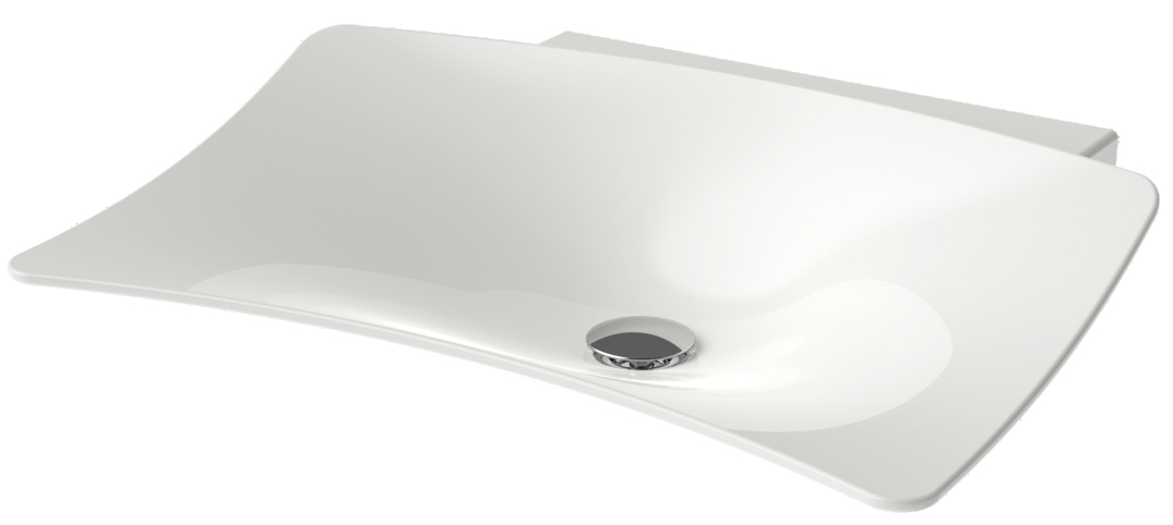 Lavamanos en politek, color blanco brillante o mate, ergonómico para minusválidos, con zona de apoyo para los codos y sin rebosadero.