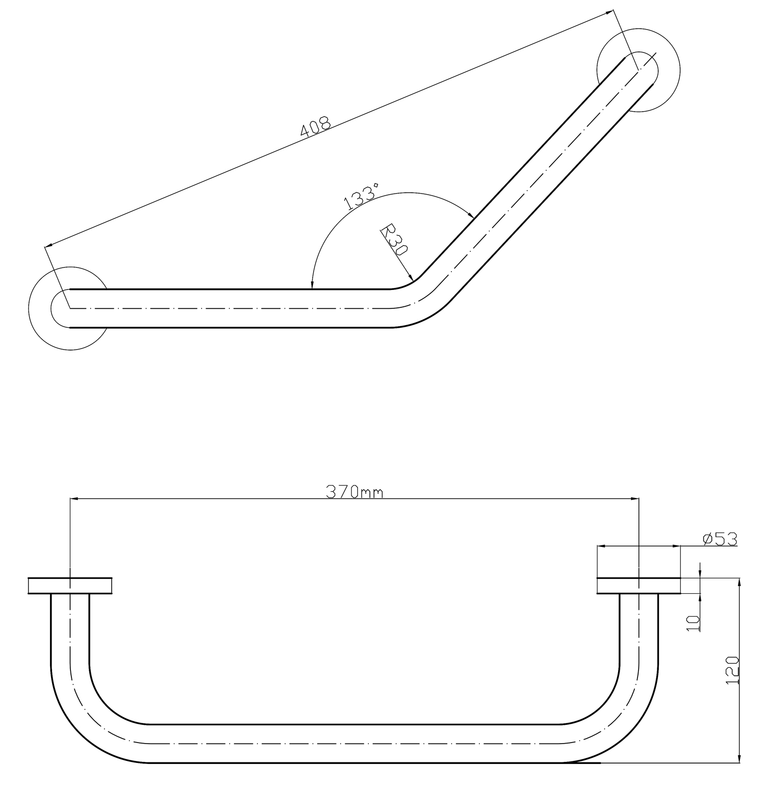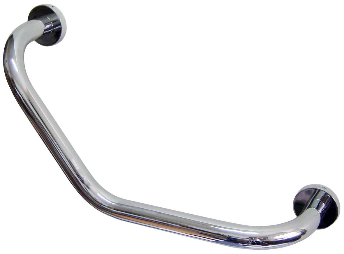 • Manillón angular con baño de cromo-níquel, tubo curvado y extremos a 90°, con pletinas para fijar a la pared.